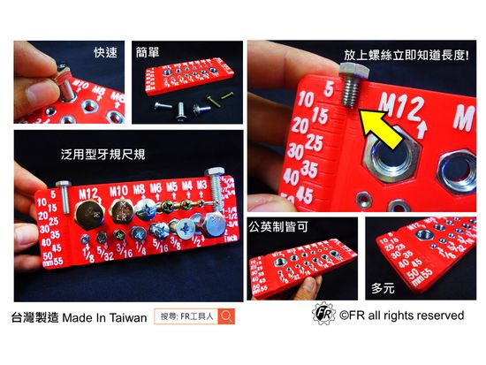 FR工具人彙整了各類螺絲規格,依照使用者角度專門設計螺絲、螺帽量測工具,讓你簡單快速的找到螺絲的規格!以專業的角度提供完整的系列商品,如:公英制小.中.大.超大、內外兼攻、大範圍、複合牙規尺規、左牙細牙、管牙系統等,簡單方便又實用,讓你成為專業的螺絲剋星!